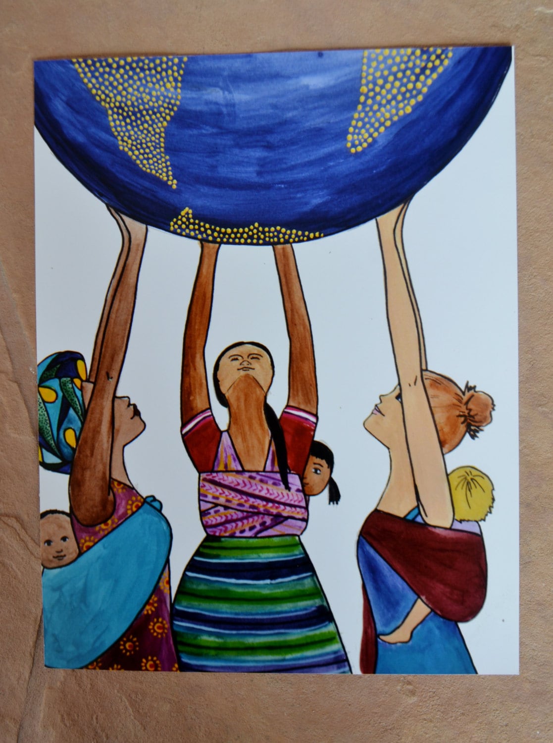 JUNTAS- *hold them close, carry them with love, treasure each sweet moment*. Inspired by my love of babywearing and the commonalities of motherhood, this print features three mamas from around the world, all carrying their babies on their backs.