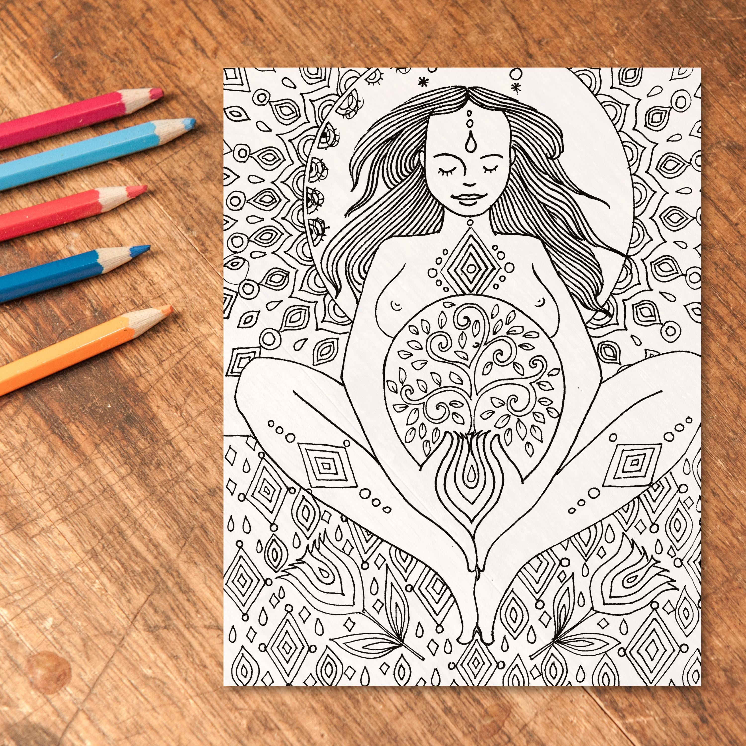 Relax with this fun birth art coloring page featuring a pregnant woman surrounded by engaging imagery.