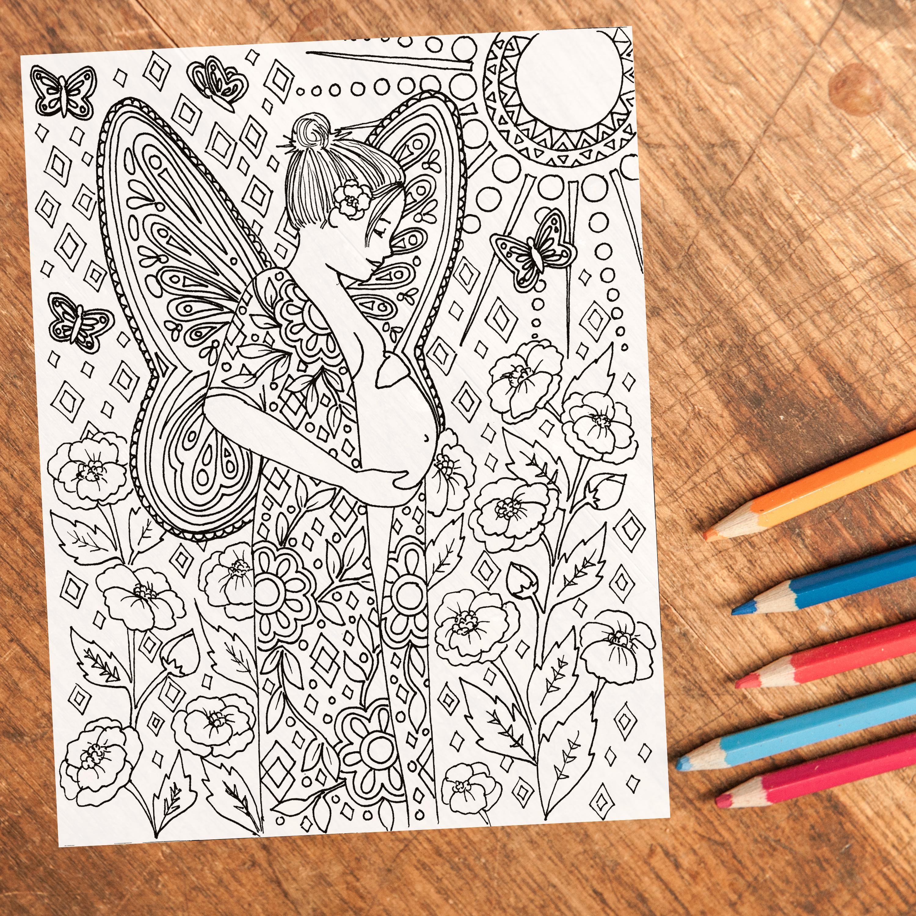 Relax with this fun birth art coloring page featuring a pregnant woman with butterfly imagery- celebrating the transformation of birth and motherhood.