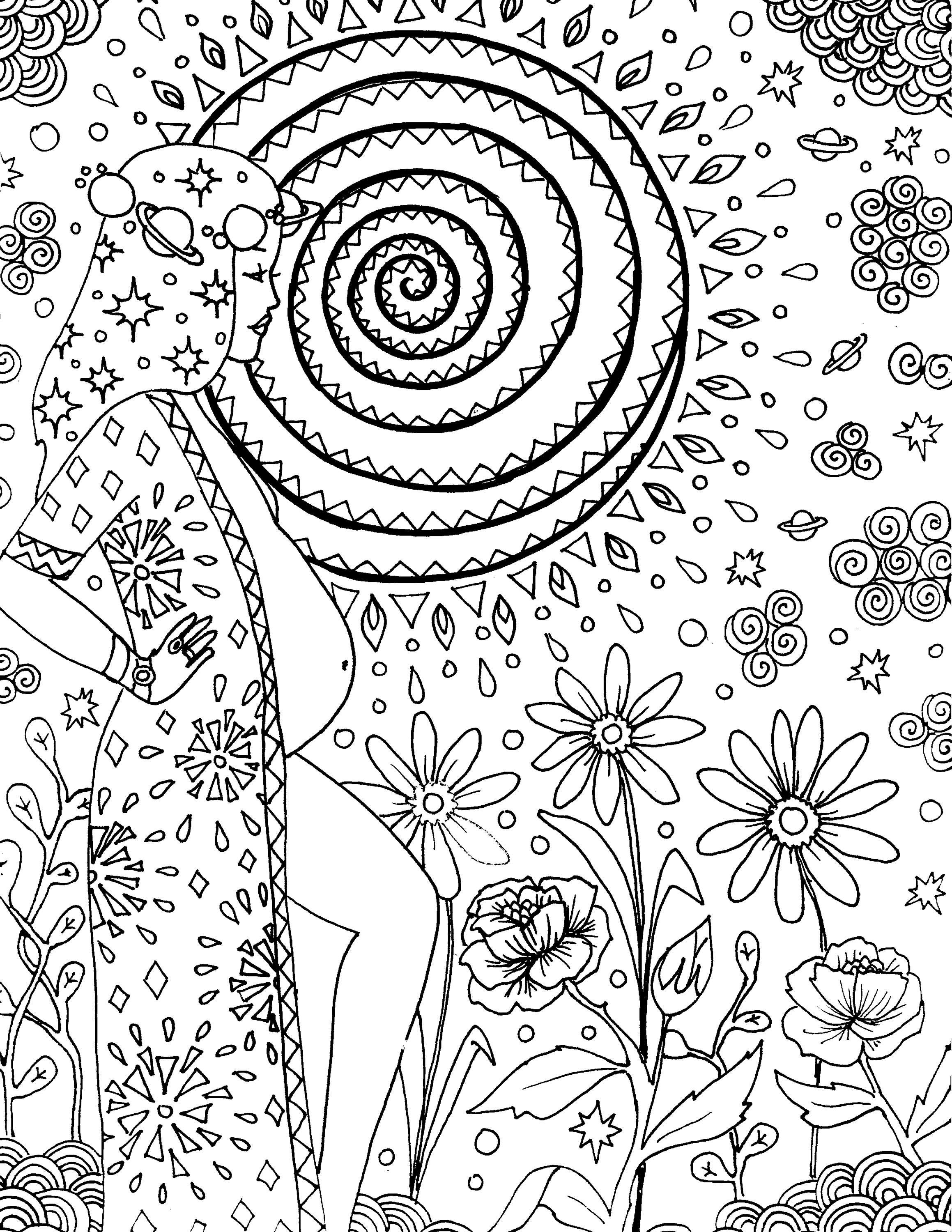 Relax with this fun birth art coloring page featuring a pregnant woman surrounded by engaging imagery, celebrating the divine feminine energy.