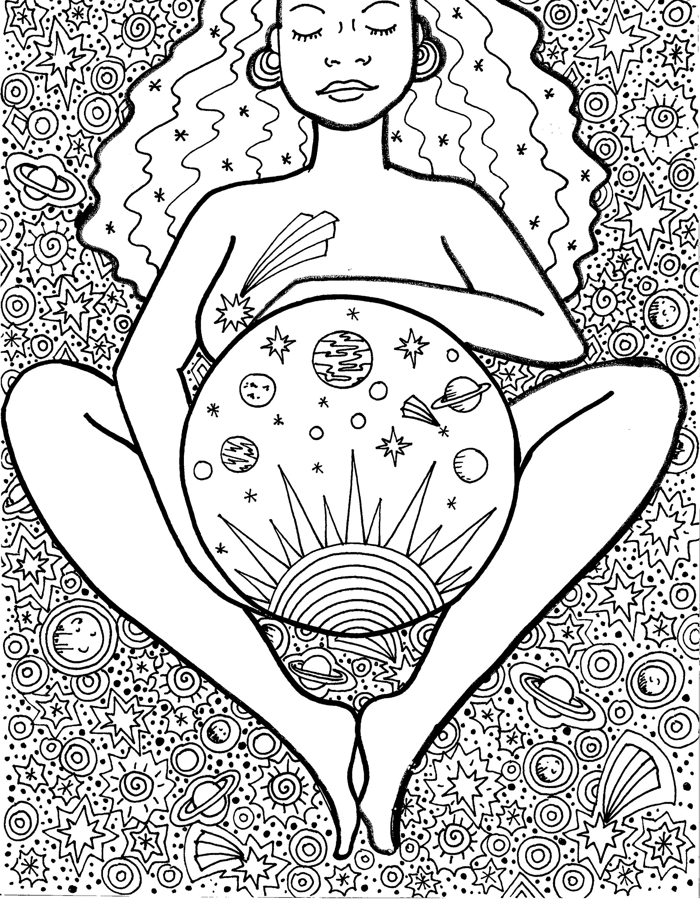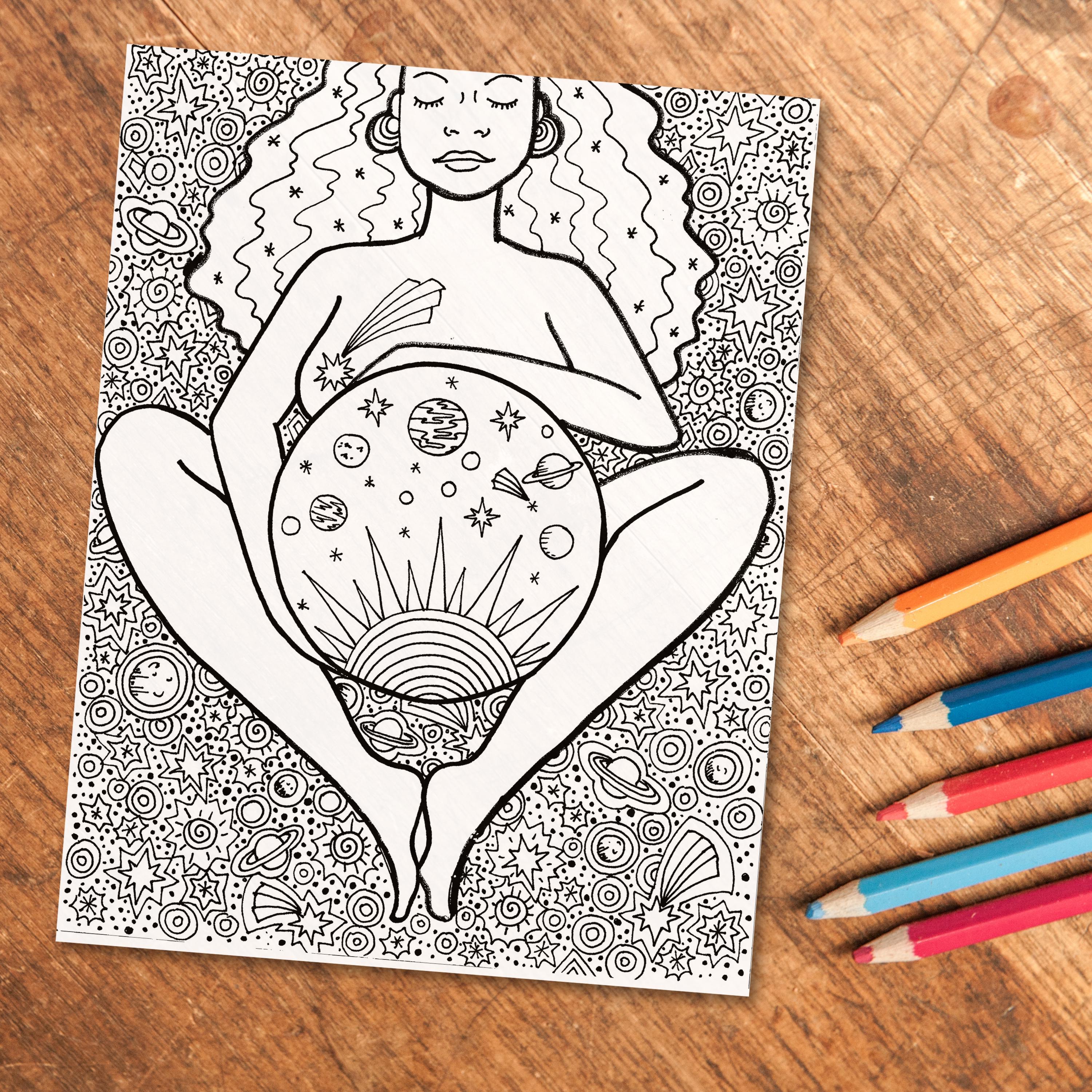 Relax with this fun birth art coloring page featuring a pregnant woman surrounded by celestial imagery, celebrating the divine feminine energy.