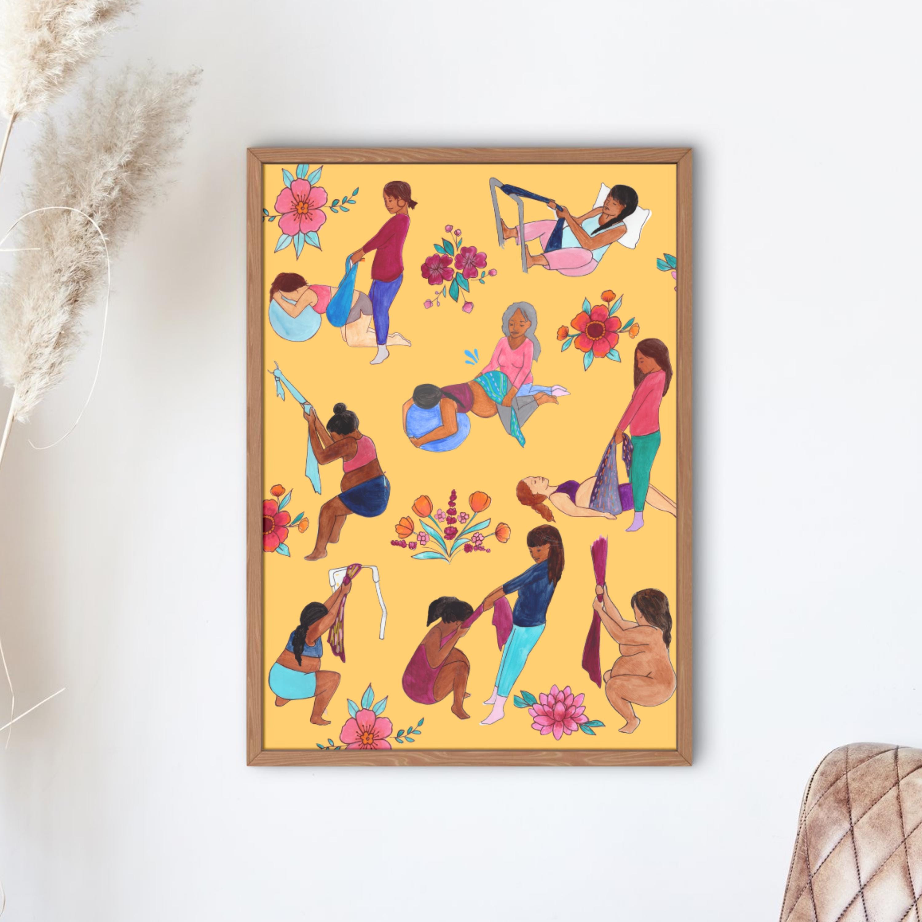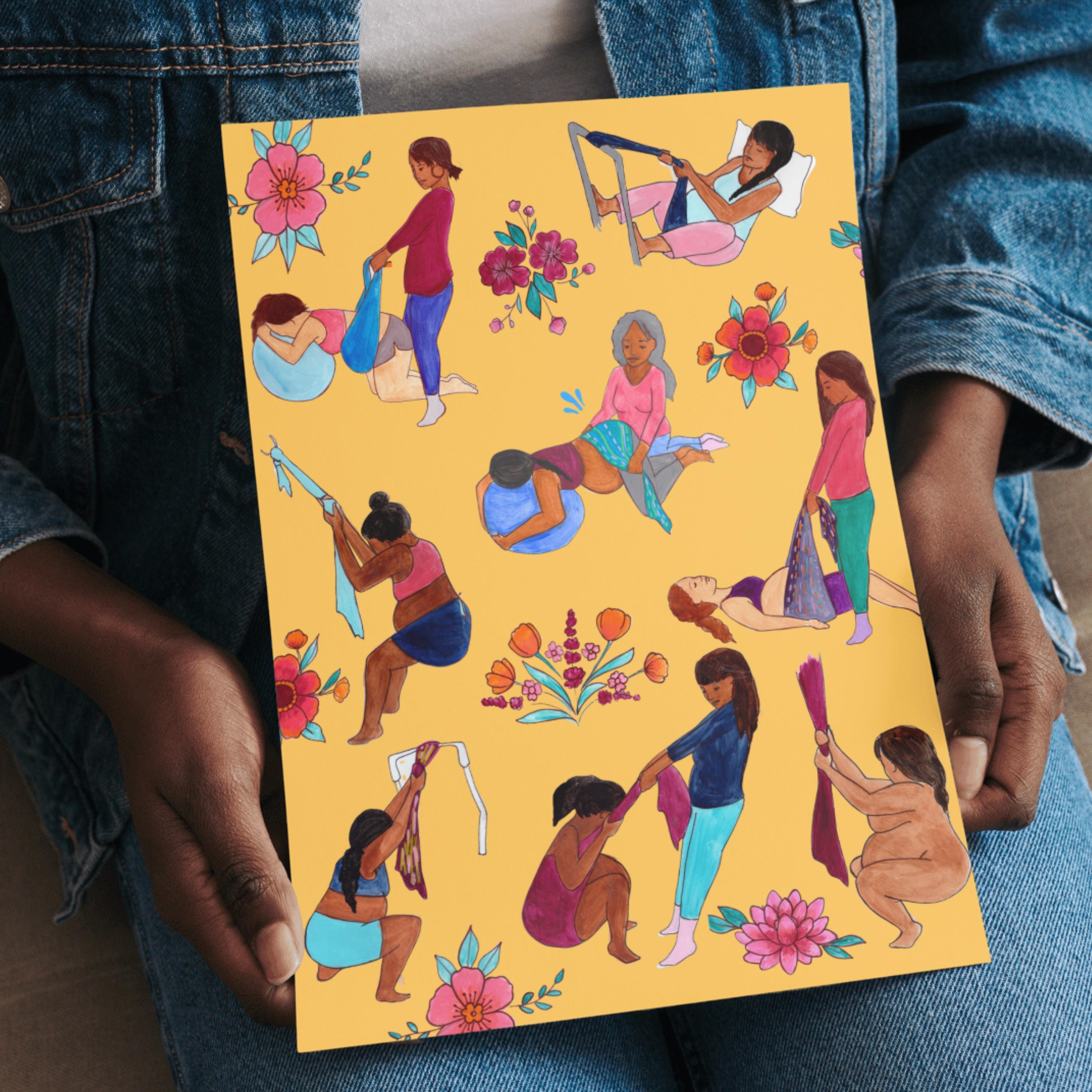 This engaging poster demonstrates different supportive labor positions using a woven cloth.