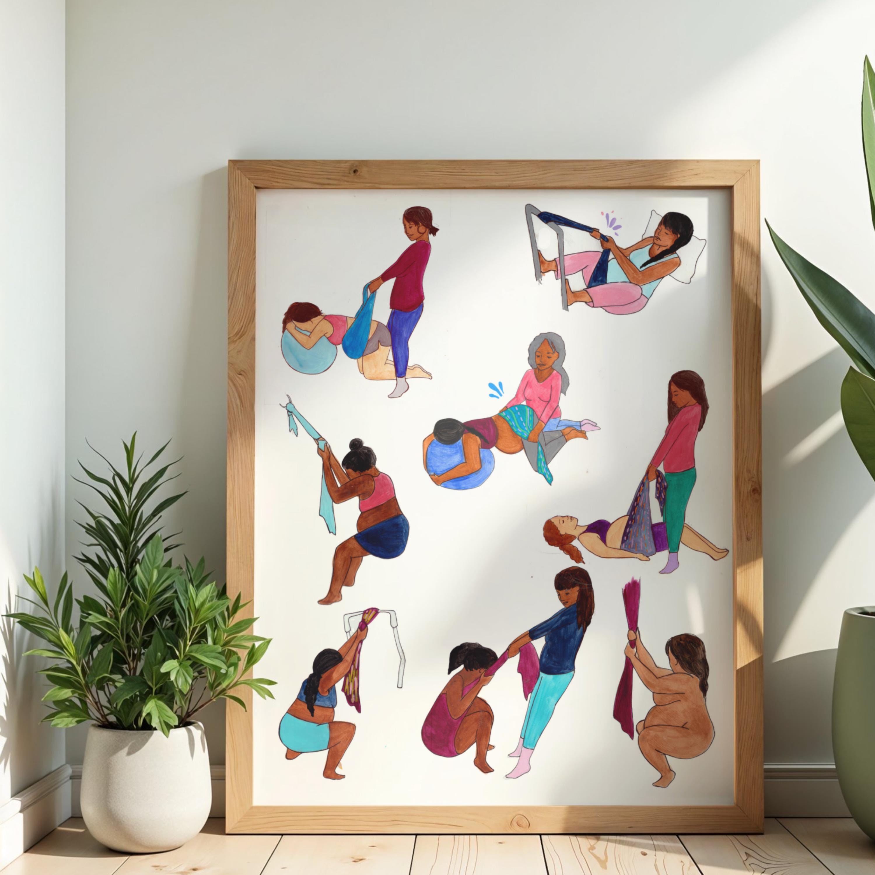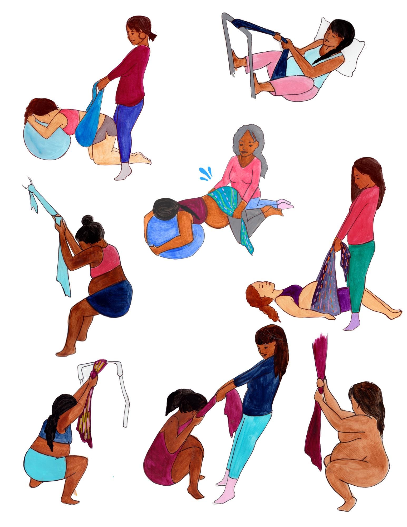 This engaging poster demonstrates different supportive labor positions using a woven cloth.