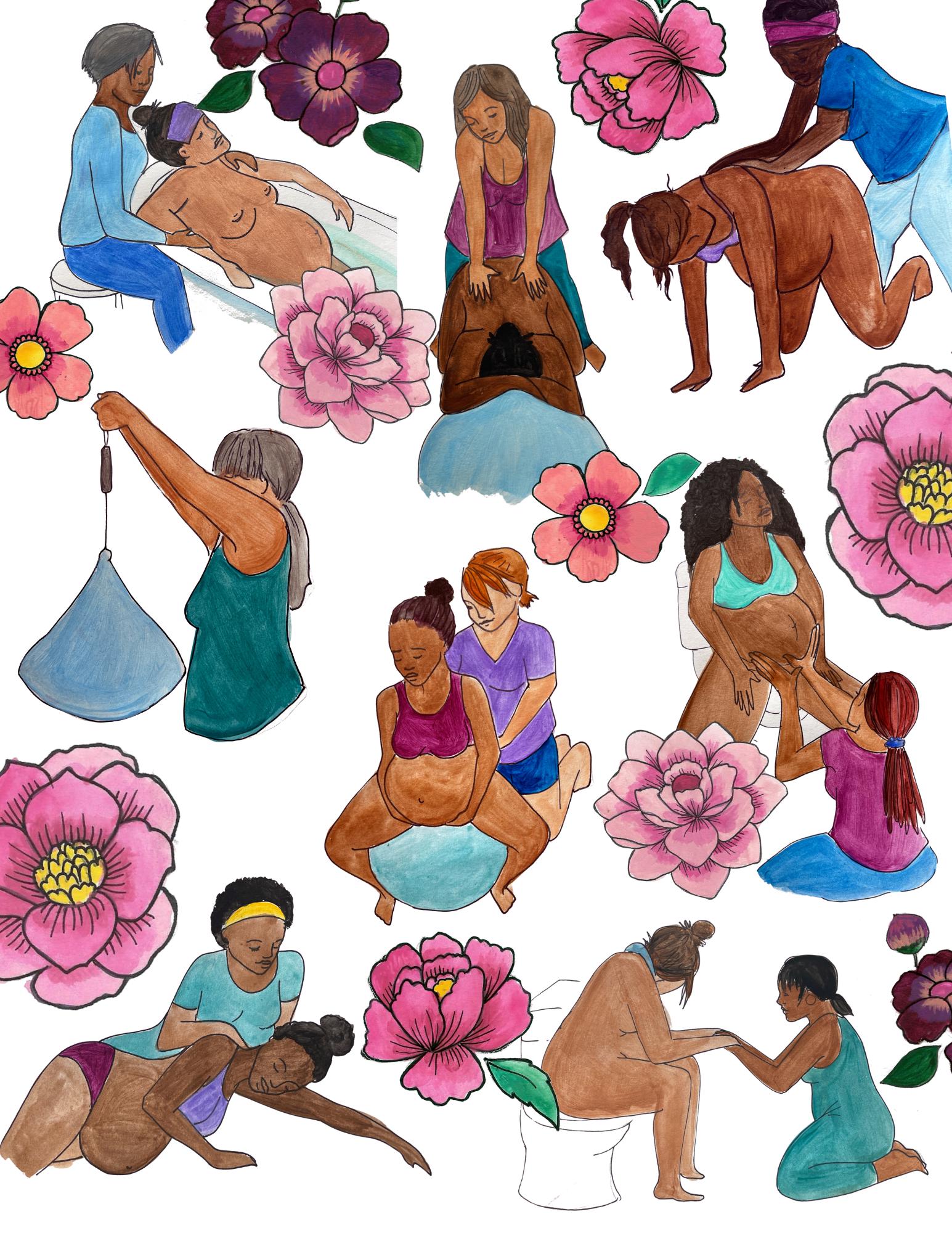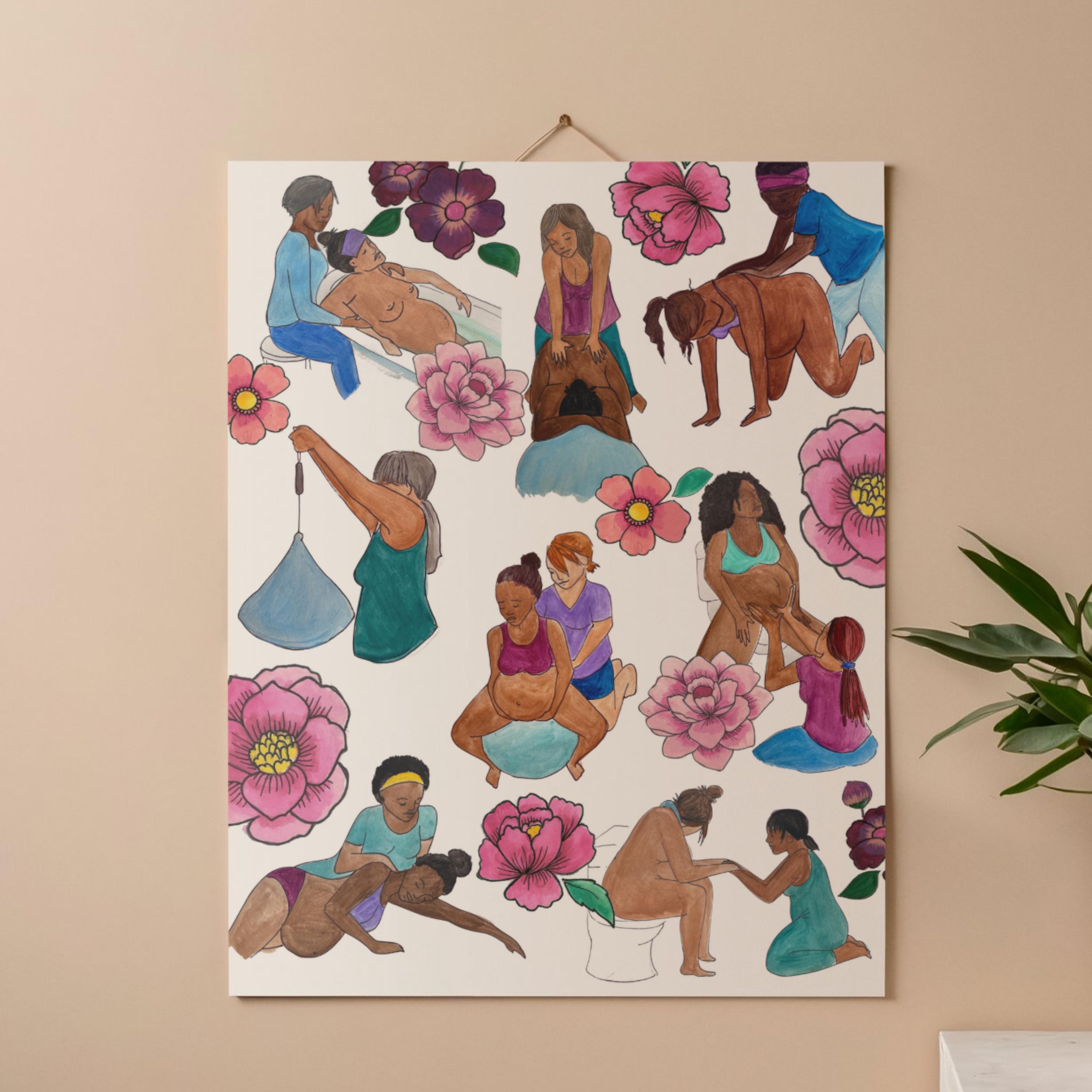 This engaging poster demonstrates different supportive labor positions. Ideal for decorating the walls of a birth center or midwifery office-- or print smaller copies as handouts for your clients!